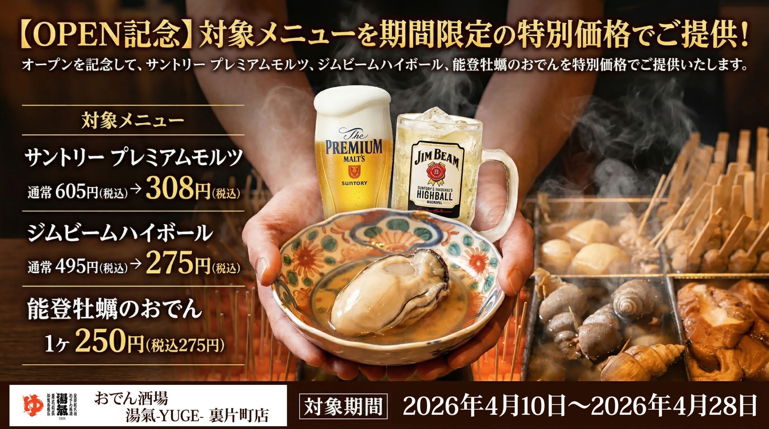 このたび当店がプロデュースした新店舗「おでん酒場 湯氣-YUGE-」が、2026年4月10日(金)、金沢・裏片町にグランドオープンいたします。